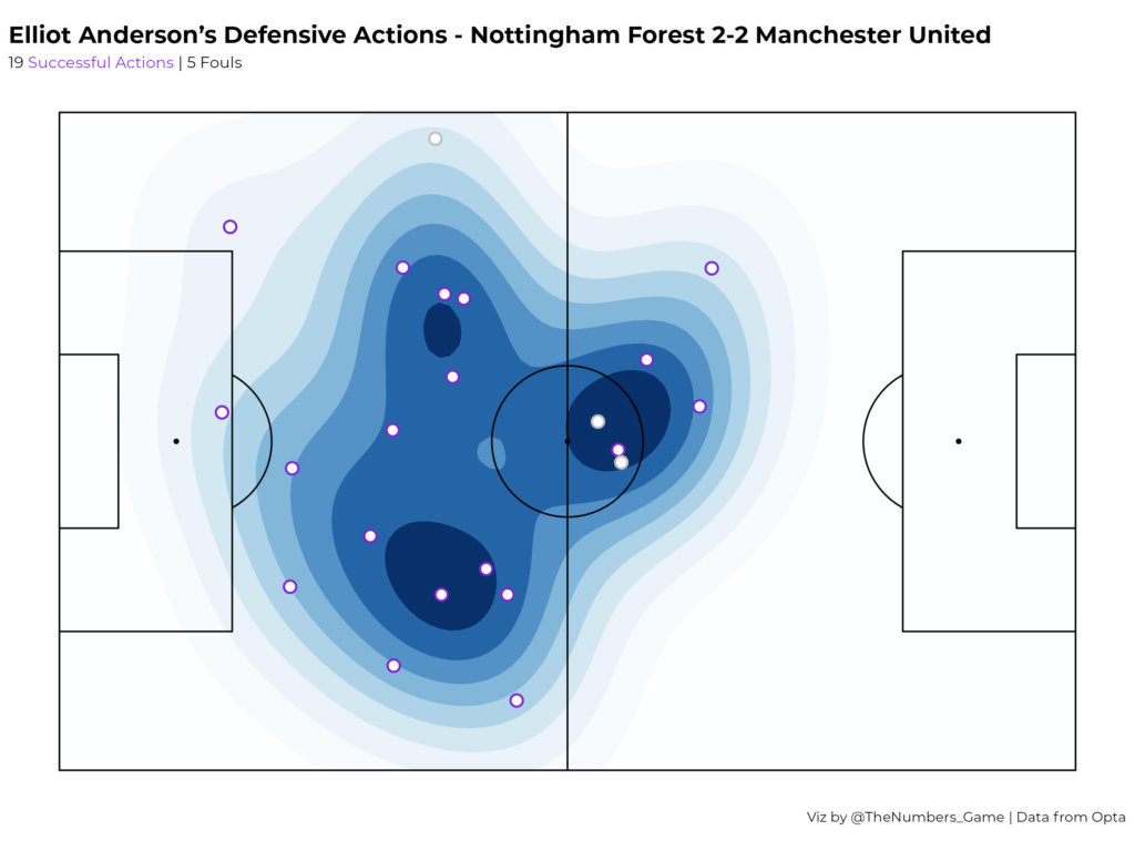 Off the ball, the domain of Anderson’s defensive presence was expansive, with his successful actions spanning both halves and the full width of the pitch. As mentioned before, a player who finds himself all over the pitch may be accused of poor discipline, but with Anderson’s actions mostly being successful, we’re safe to say that he did well as a defensive screen.