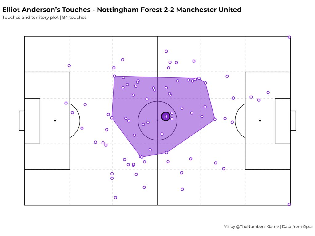 Looking on a high-level, Anderson was ever-present across the pitch, with his territory spanning a large range of the central area. Touches in both boxes and on both wings gives us the sense of a player who roams around the field, generating impact wherever possible. Whilst this may raise concerns about positional discipline (Bruno Fernandes has often been criticised for his roaming), we’ll see through further analysis that Anderson’s wide reach was only a positive against United.
