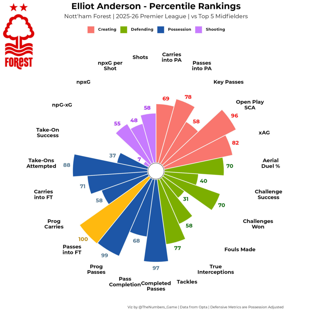 Volume within ball progression is where Elliot Anderson shines. Compared to midfielders in Europe’s top five leagues, the 22-year-old ranks amongst the elite for completed passes (97), progressive passes (99), passes into the final third (100), attempted take-ons (88) and carries into the final third (71). It’s obvious to see that Anderson loves to get forward on the ball, driving his team through both passes and carries.