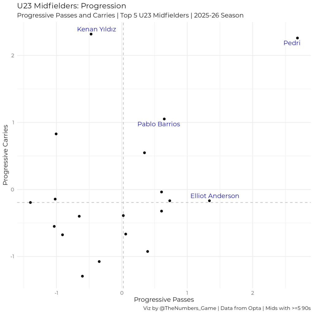In fact, his multifaceted progression style is quite unique. Looking at u23 midfielders in Europe this season, Anderson finds himself in a small group of players that excel in both progressive passes and progressive carries. This dual nature makes him versatile, being able to adapt to different game situations.