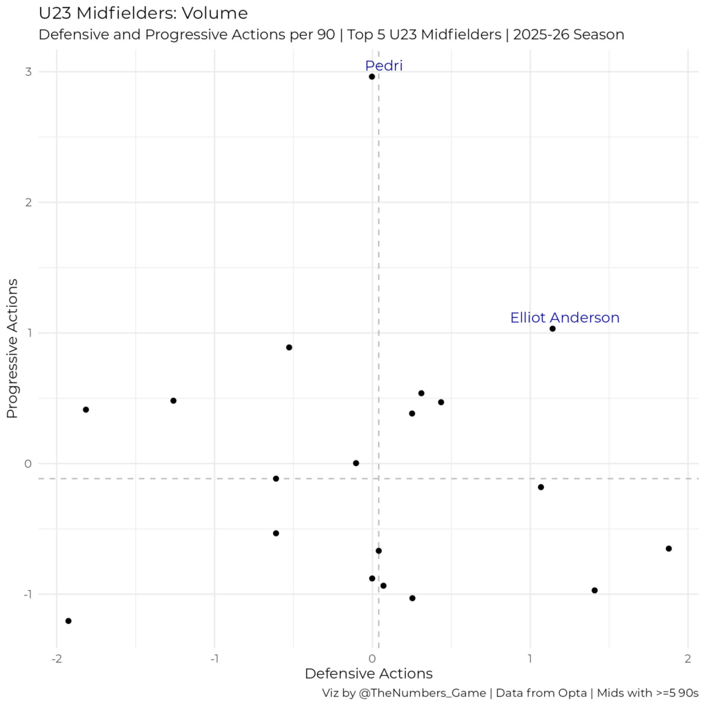 Yet again, Anderson stands out amongst his peers when combining both in and out of possession volume. Again, looking at u23 midfielders, Anderson is the only player to lie one standard deviation above the mean for both defensive and progressive actions per 90. In other words, Anderson is the only player with elite levels of volume in getting the ball forward and winning the ball back. Thinking about that Sean Dyche quote: “Put the ball in that end, stop it going in that end”, Anderson epitomises this.